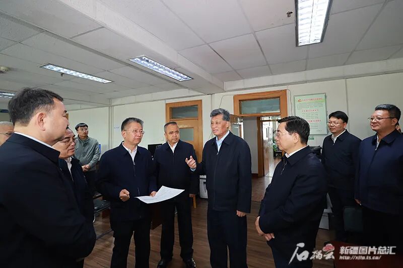 10月26日,自治区党委书记马兴瑞,自治区党委副书记、自治区主席艾尔肯·吐尼亚孜在自治区自然资源厅,详细了解采矿权、探矿权出让等业务审批流程改革进展。石榴云/新疆日报记者 崔志坚摄