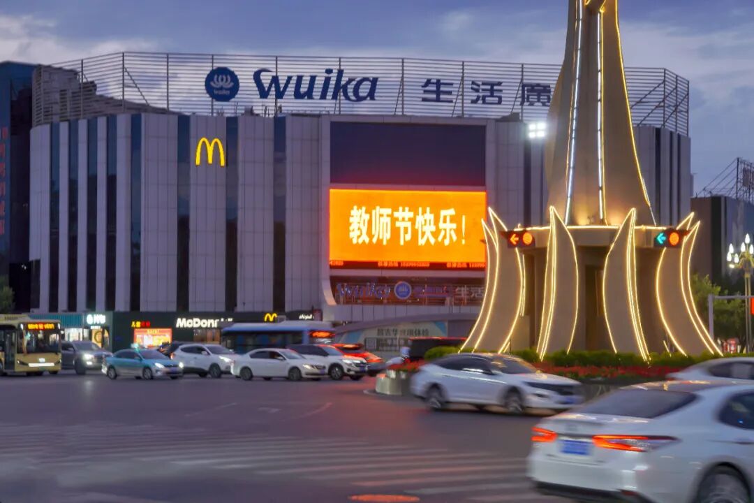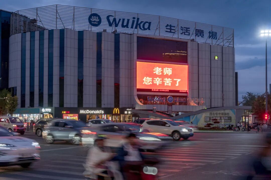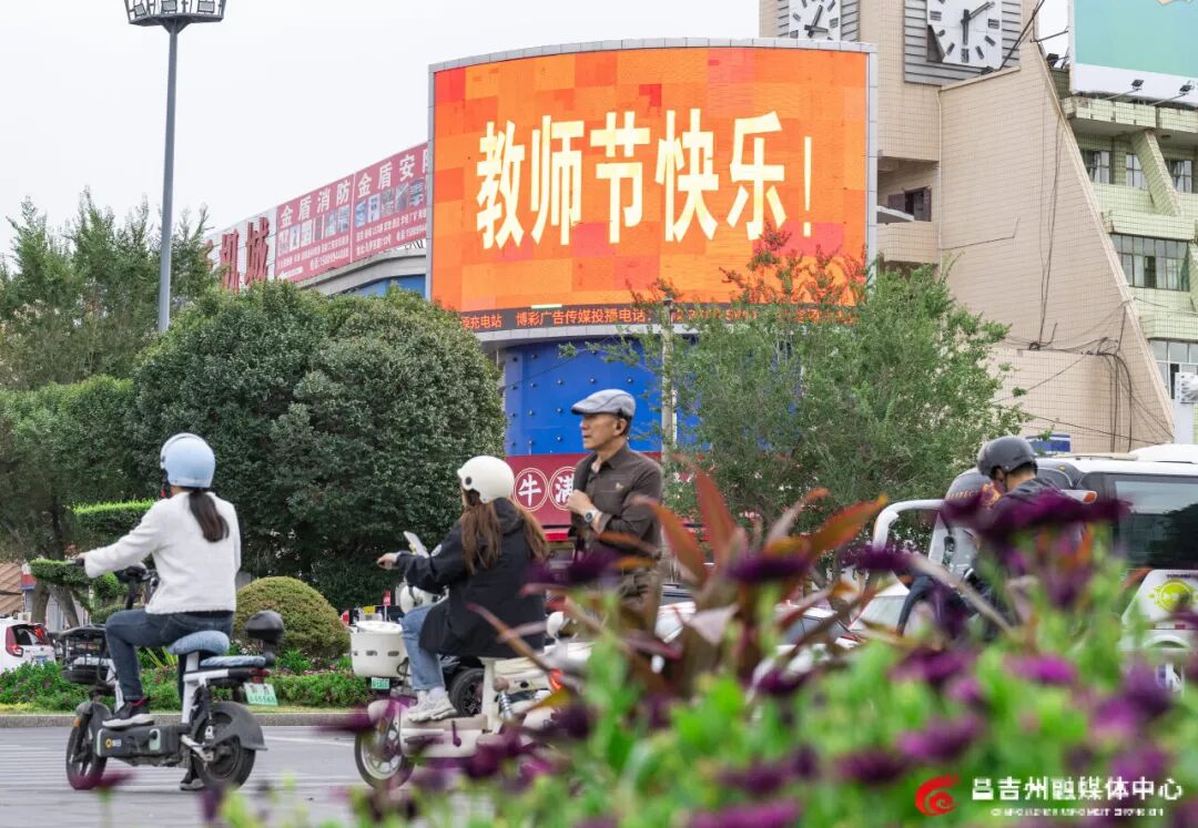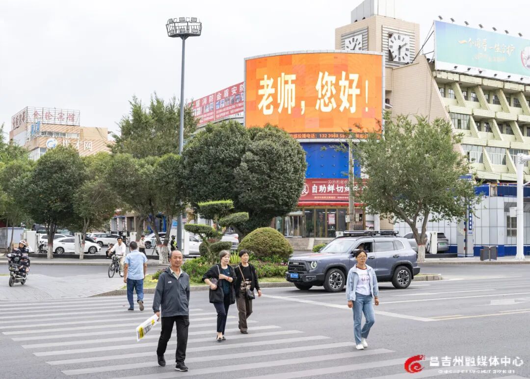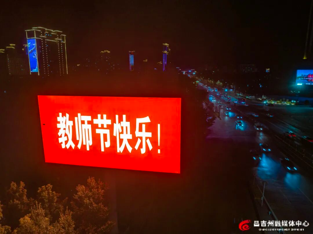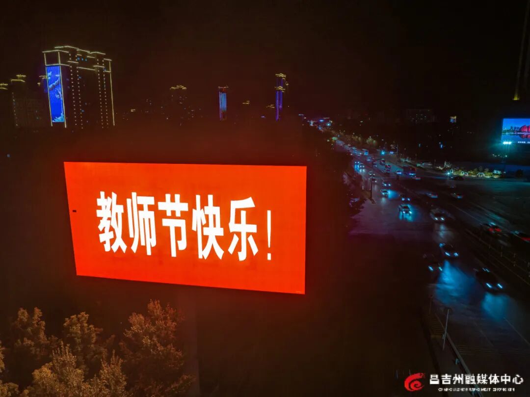 ▲昌吉市乌伊路与北京路路口的大屏幕上播放教师节祝福语。(昌吉州融媒体中心何龙摄)