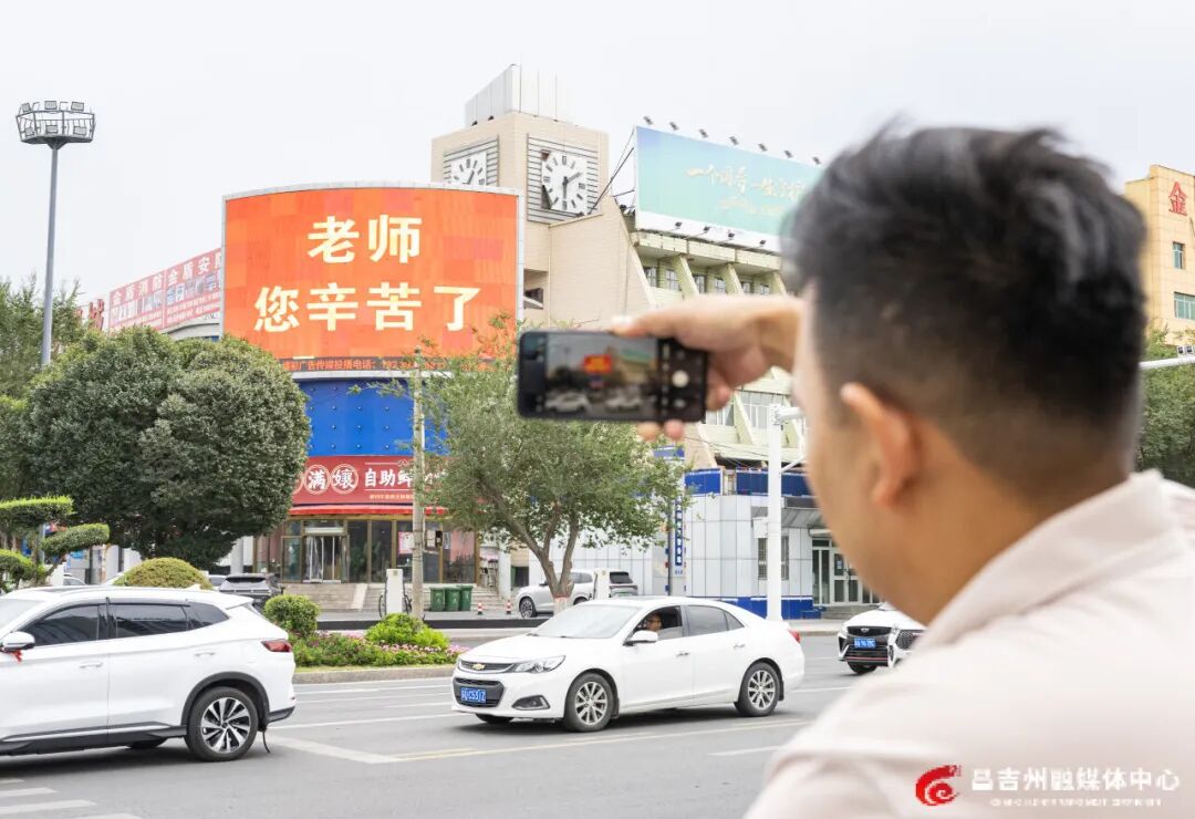 ▲昌吉市乌伊路与北京路路口,一位路过的市民在拿手机拍摄大屏幕上的教师节祝福标语。(昌吉州融媒体中心何龙摄)