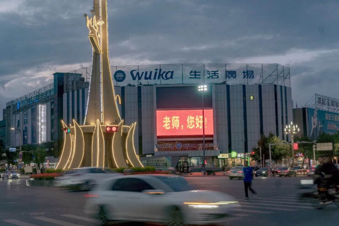 ▲昌吉市乌伊路与延安路路口的大屏幕上播放教师节祝福语。(杨斌摄)