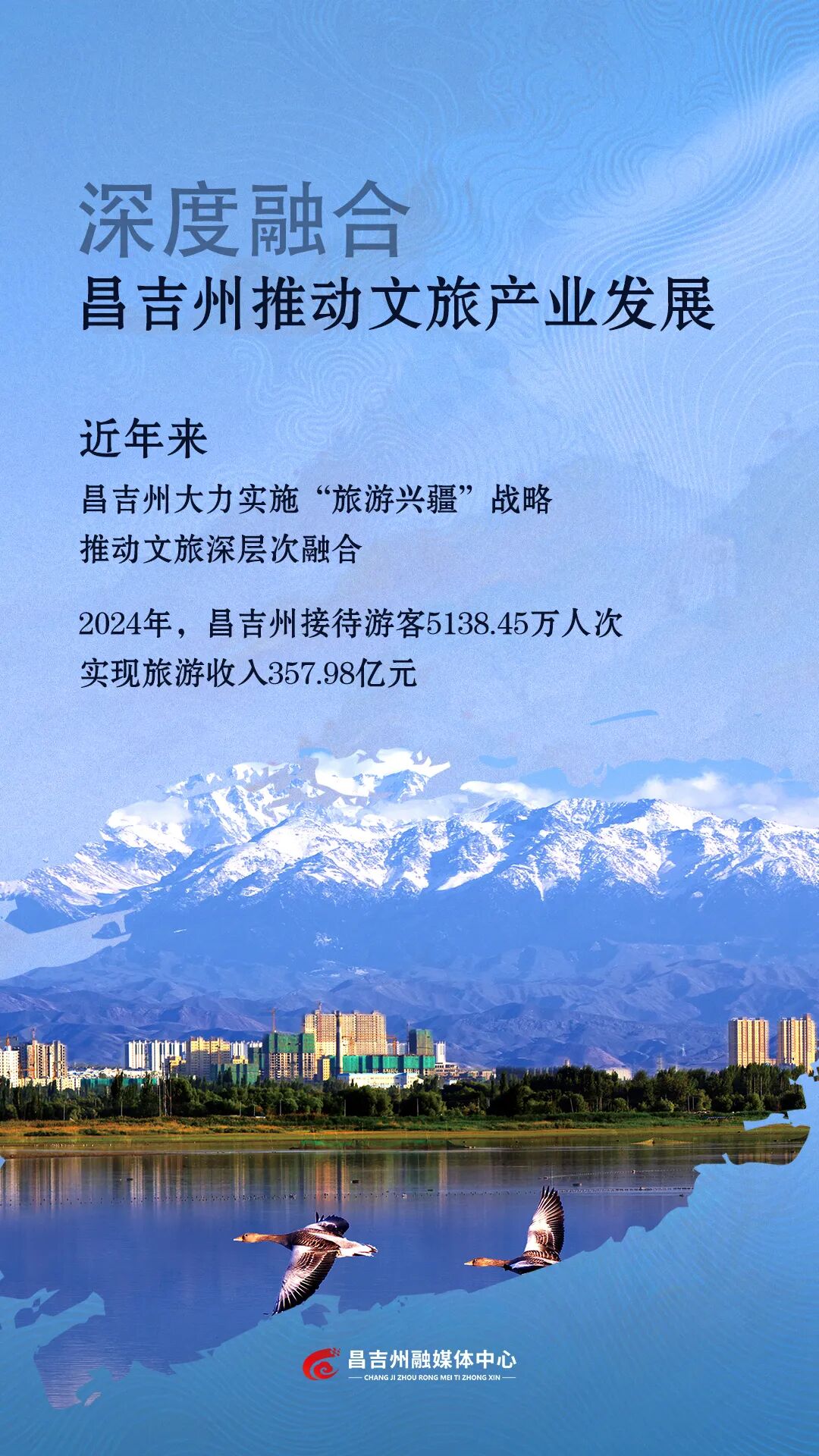 文化是旅游的灵魂,旅游是文化的载体。昌吉州坚持“宜融则融、能融尽融,以文促旅、以旅彰文”,依托优美的山水、灿烂的文化和优良的生态,紧扣“旅游+”主线,推动文化、体育与旅游全业态、全产业链提质升级。