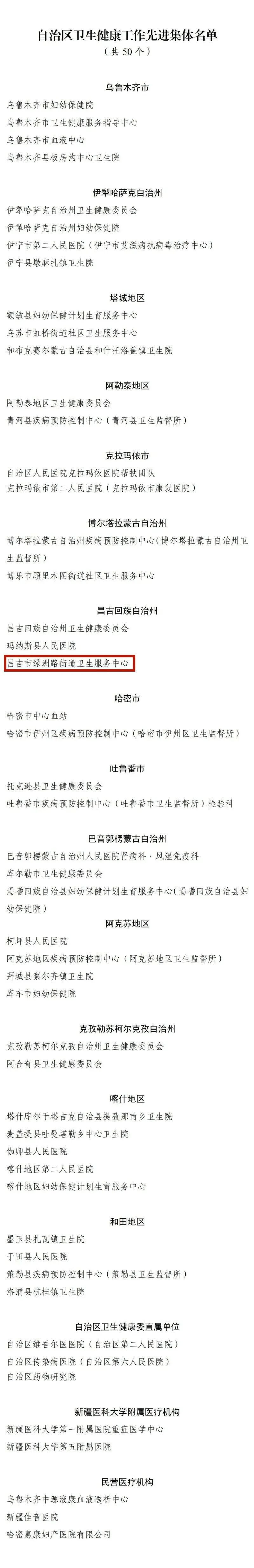 10月22日,记者从自治区卫生健康委获悉,为发挥先进典型示范引领作用,激励全区卫生健康系统广大干部职工奋发有为,经自治区党委和政府批准,决定授予乌鲁木齐市妇幼保健院等50个单位“自治区卫生健康工作先进集体”称号,授予孙高峰等100名同志“自治区卫生健康工作先进个人”称号。
