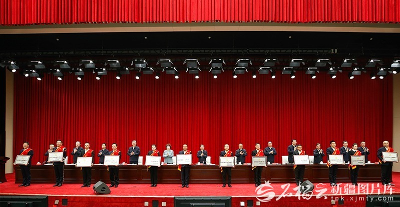 12月3日,在自治区驻村工作会议上,表彰自治区驻村工作优秀工作队、优秀派驻单位和优秀农牧业、文化、医疗下沉巡回服务团队。这是自治区党委书记陈小江,自治区党委副书记、自治区主席艾尔肯·吐尼亚孜等领导为先进典型代表颁奖。天山网-新疆日报记者 谢龙摄