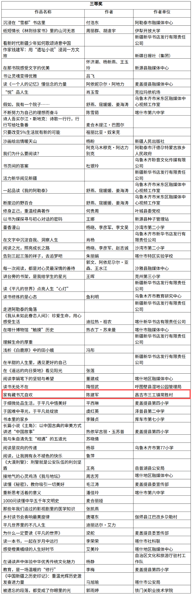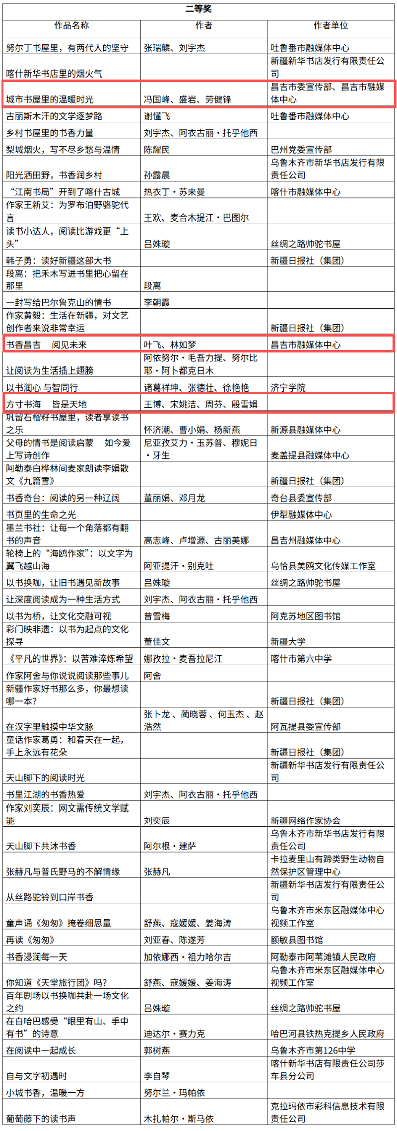 由自治区党委宣传部指导,新疆日报社(集团)主办的“书香满天山”全民阅读短视频征集活动,自启动以来收到大量优秀作品,经评审,评选出一等奖10件、二等奖50件、三等奖60件,组织奖10个。为维护活动的公平公正,培育尊重原创、恪守诚信的品格,现将拟获奖名单公示如下,接受社会各界监督。