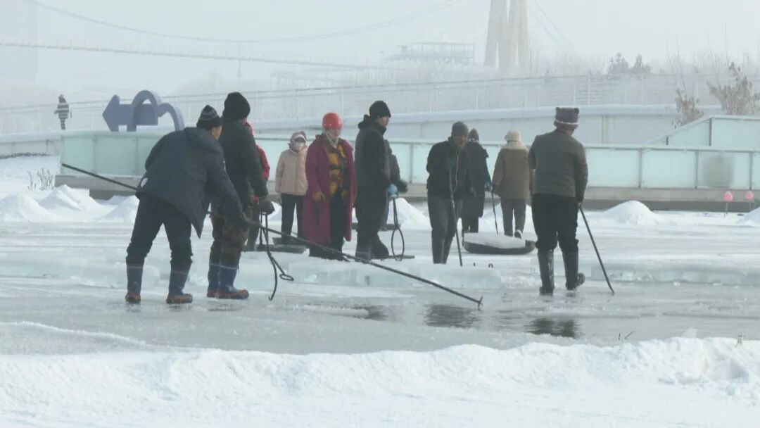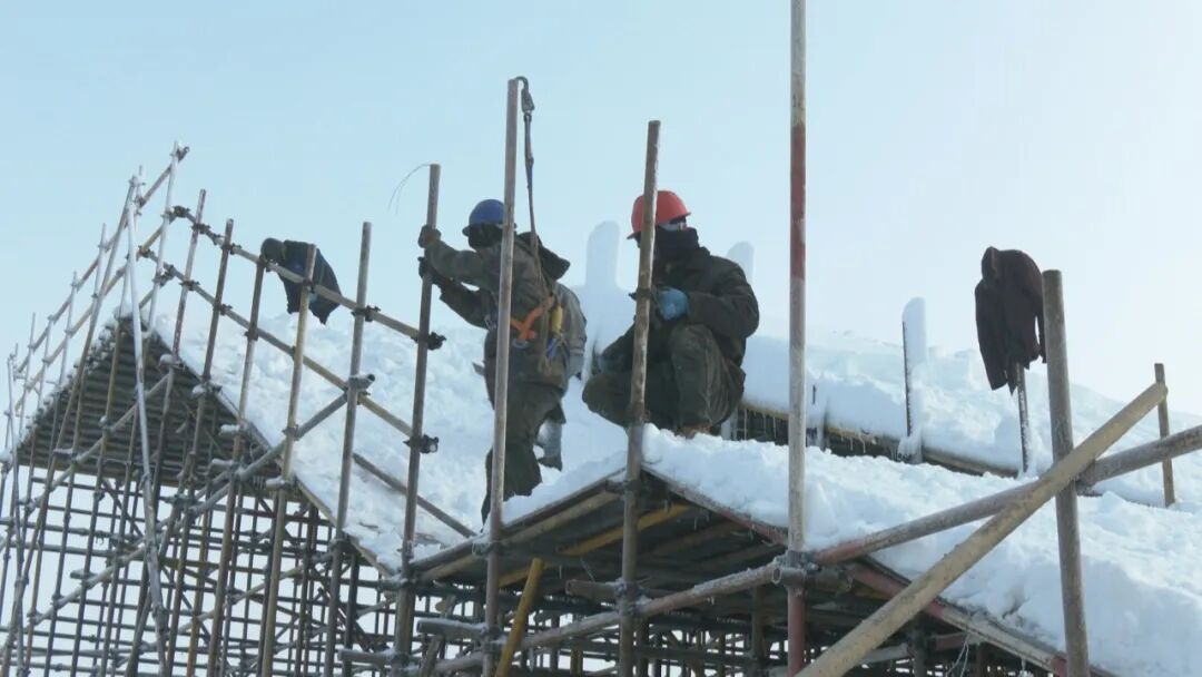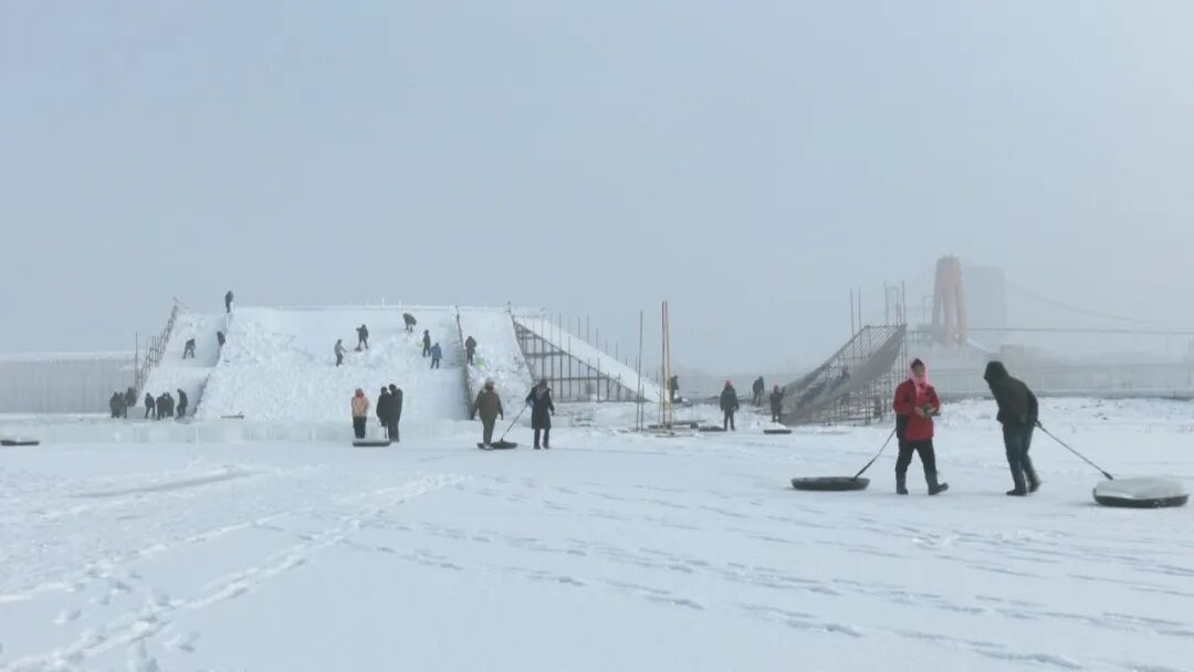 冰雪大世界项目施工现场一派火热景象。裁冰机持续运转,正为后续的冰雪景观构筑坚实基础;另一侧,工人们将切割整齐的冰块拉运至大型滑梯旁的空地,有序进行组装。