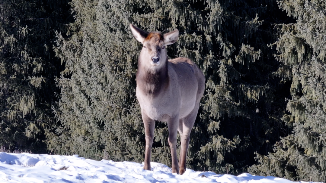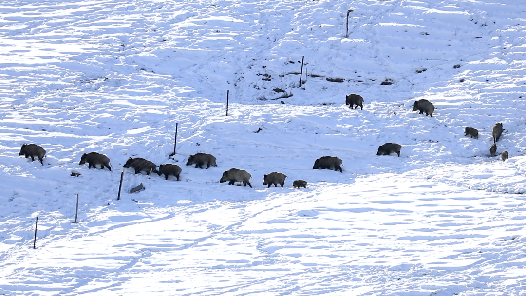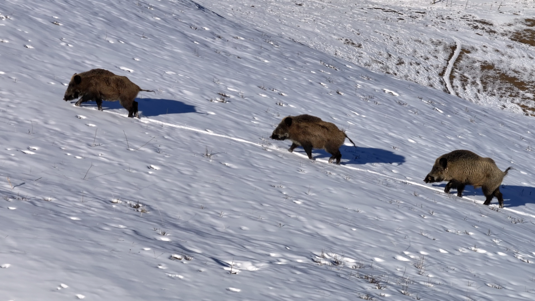 天山马鹿或成群结队,或三三两两散落其间。灰棕色的皮毛与白雪相映,尾部标志性的白色心形斑纹格外醒目,偶有几头马鹿驻足远眺,身姿挺拔如林间精灵,徜徉于松林与草场之间。野猪群则带着几分憨态,集群拱掘土地搜寻根茎与果实,黑色鬃毛上沾着雪粒,幼猪紧跟在成年野猪身后,时而钻入林间,时而在开阔地休憩,与马鹿互不惊扰、安然共处。