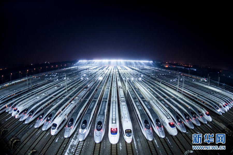 动车组停靠在武汉动车段的存车线上,准备进行检修和保温作业(2018年2月1日摄)。(新华社记者 肖艺九 摄)