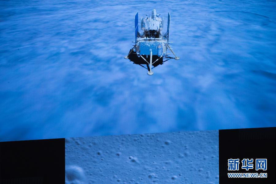 2020年12月1日23时11分,嫦娥五号探测器成功着陆在月球正面西经51.8度、北纬43.1度附近的预选着陆区,并传回着陆影像图。这是在北京航天飞行控制中心拍摄的嫦娥五号探测器落月瞬间。(新华社记者 金立旺 摄)