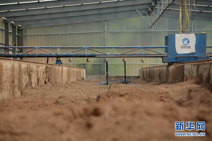 在福建省福清市永诚华多种猪公司猪场内,半自动化机械将收集的养殖粪污喷洒至垫料上。这是福建首创的“异位发酵床”技术,发酵后的粪污可以作为有机肥源,并可以让养殖场实现污染“零排放”(2019年8月12日摄)。(新华社记者 林超 摄)