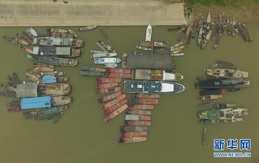 在湖南常德汉寿县蒋家嘴镇,待回收的铁渔船停靠在洞庭湖边(2019年12月17日摄,无人机照片)。2020年1月1日零时起,长江流域332个自然保护区和水产种质资源保护区全面禁止生产性捕捞。(新华社记者 薛宇舸 摄)