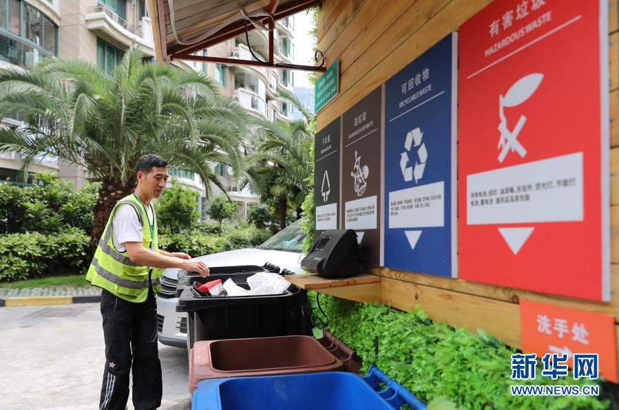 在上海市虹口区嘉兴路街道一处小区,保洁工对居民分类投放的生活垃圾进行分拣(2019年6月24日摄)。(新华社记者 方喆 摄)