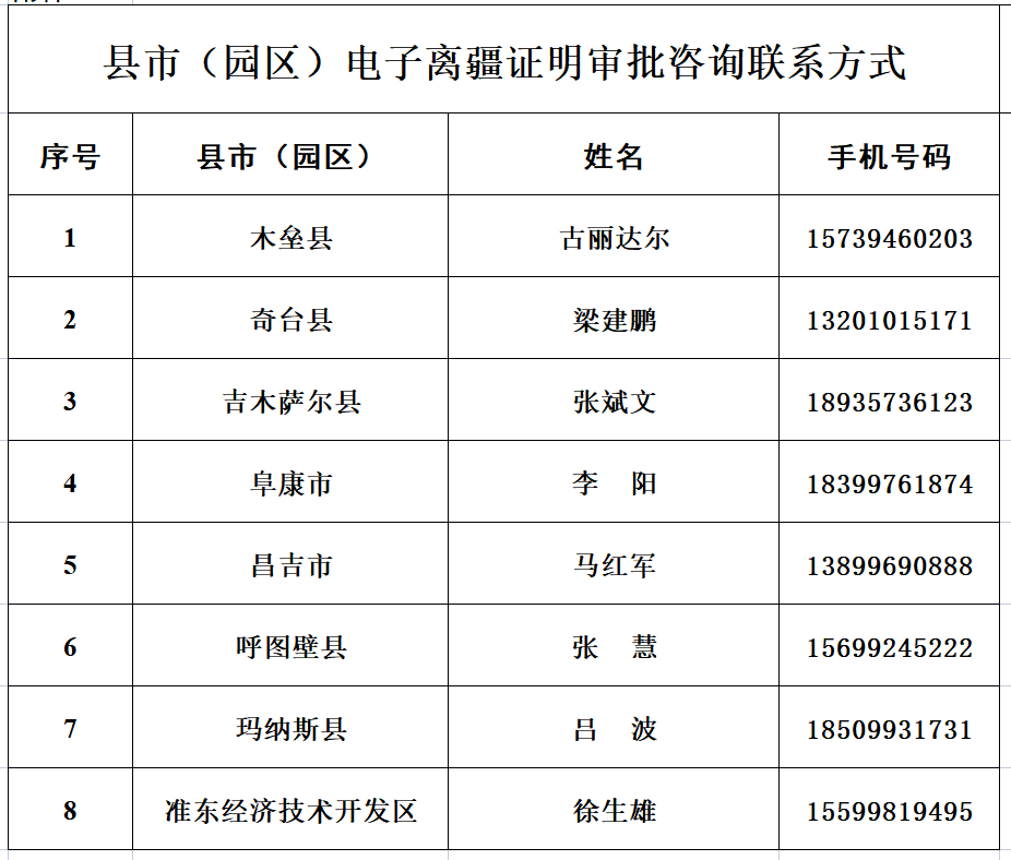 电子离疆证明咨询电话:如有申报流程等相关咨询,申报人员可致电所在县市(园区)新冠肺炎疫情防控工作指挥部相关工作人员。