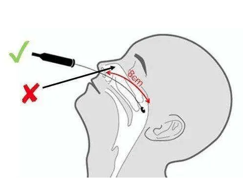 采样人员一手轻扶被采集人员的头部,一手执拭子,拭子贴鼻孔进入,沿下鼻道的底部向后缓缓深入,由于鼻道呈弧形,不可用力过猛,以免发生外伤出血。待拭子顶端到达鼻咽腔后壁时,轻轻旋转一周(如遇反射性咳嗽,应停留片刻),然后缓缓取出拭子,将拭子头浸入含2~3ml 病毒保存液(也可使用等渗盐溶液、组织培养液或磷酸盐缓冲液)的管中,尾部弃去,旋紧管盖。