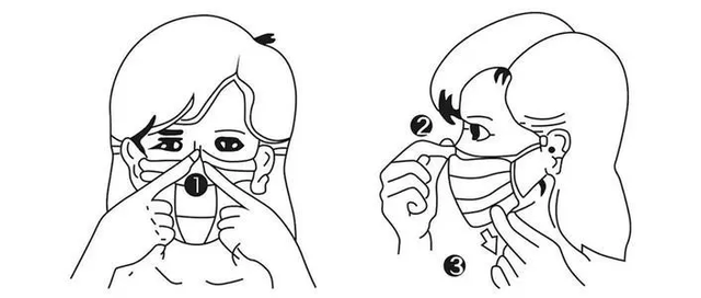 (1)确认口罩上下及内外(鼻夹边向上,深色面向外)后,将口罩罩住鼻、口、下巴。