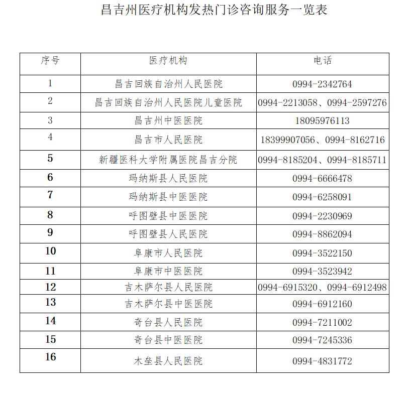 现将昌吉州医疗机构发热门诊就医咨询服务进行公示。
