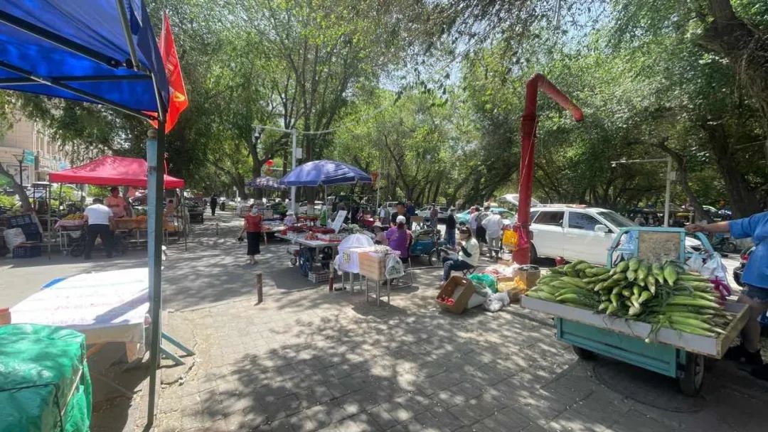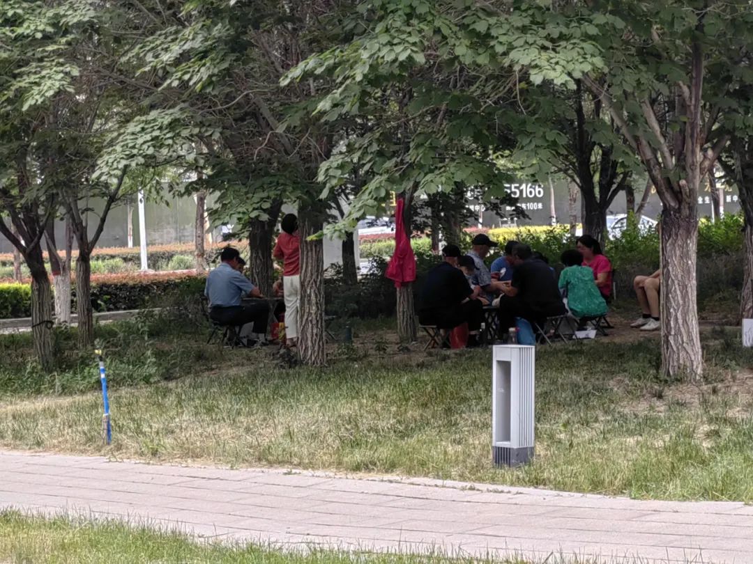 塔城路带状公园内居民在绿化带内休闲娱乐