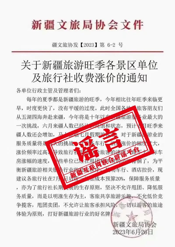 近日,微信朋友圈及个别微信群组出现传发《关于新疆旅游旺季各景区单位及旅行社收费涨价的通知》图片,并称“建议各旅行社在7月1日后统一增加成本预算20%”等信息,引发部分网民关注讨论。该信息为谣言,发文单位新疆文旅局协会不存在。