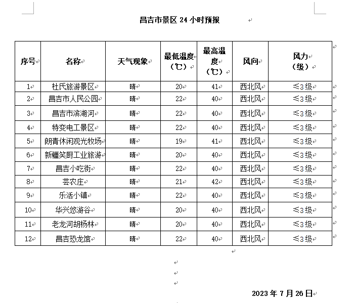 昌吉市气象台2023年7月26日11时6分将高温橙色升级为高温红色预警信号:预计今天中午至27日,昌吉市城区、六工镇到老龙河一带及沙漠管护站周边的局部地区将出现40℃以上的高温天气,请注意防暑降温和用火安全, 加强防范山区局地融雪型洪水。