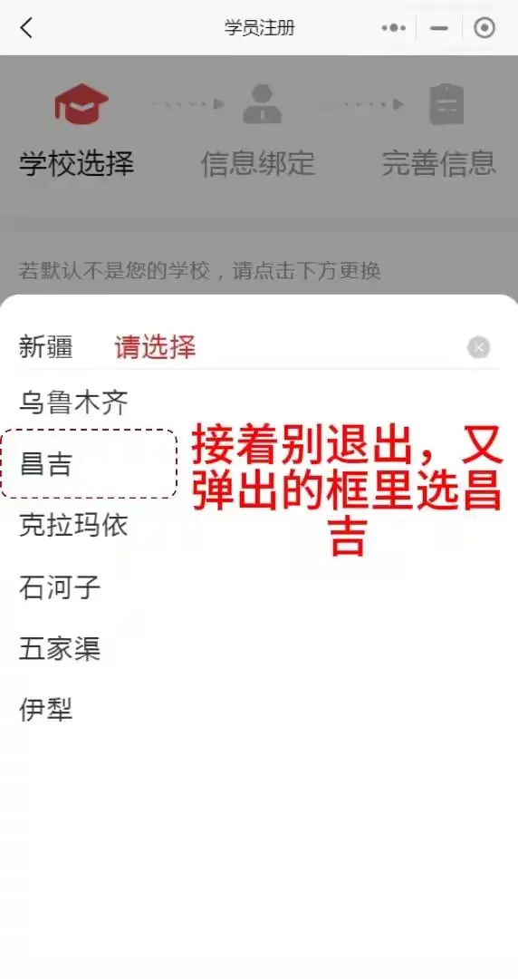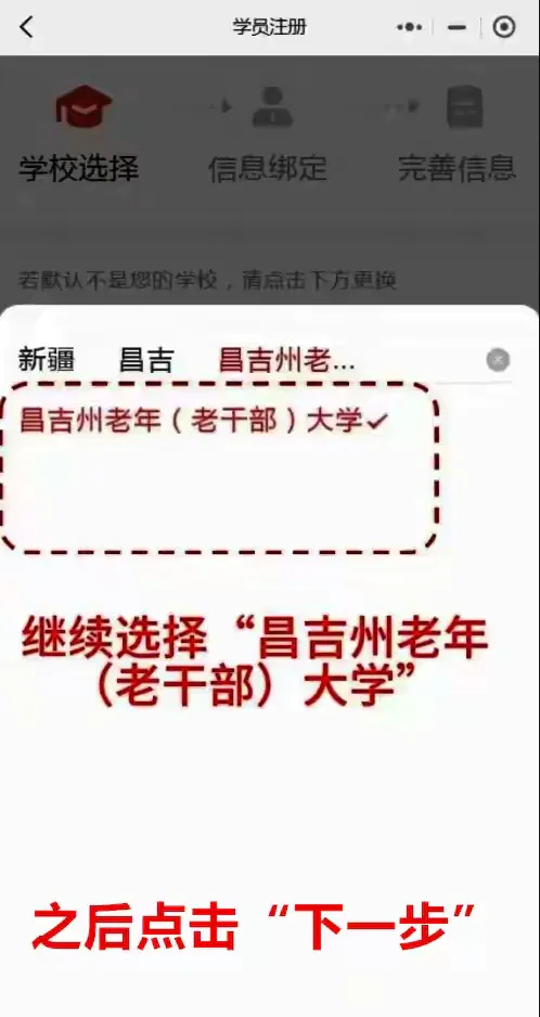 请点击进入昌吉州老年(老干部)大学报名系统,并参照以下操作步骤流程完成报名注册。(点击图片可放大查看操作步骤↓)