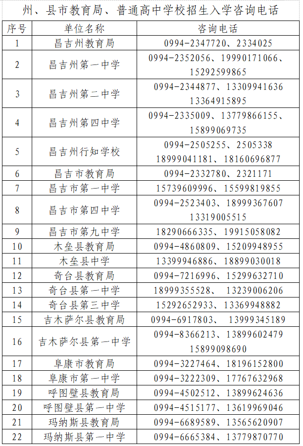 附件:州、县市教育局、普通高中学校招生入学咨询电话