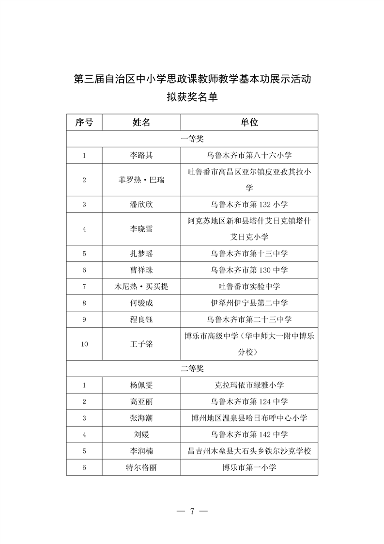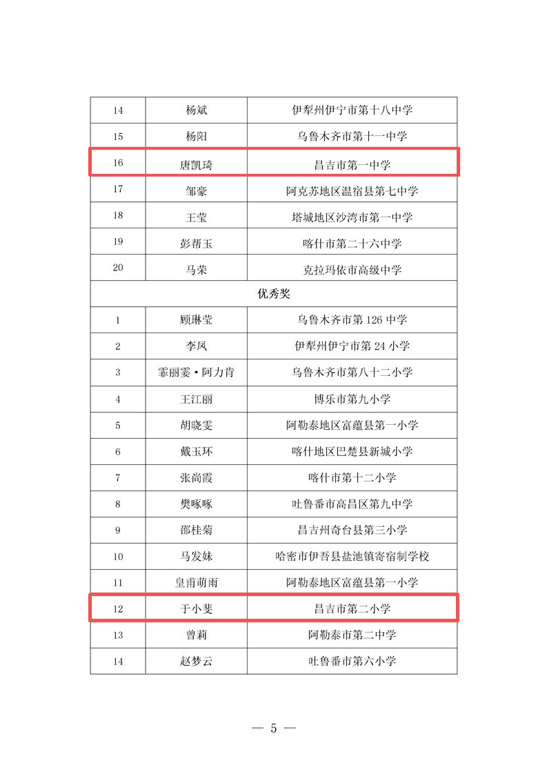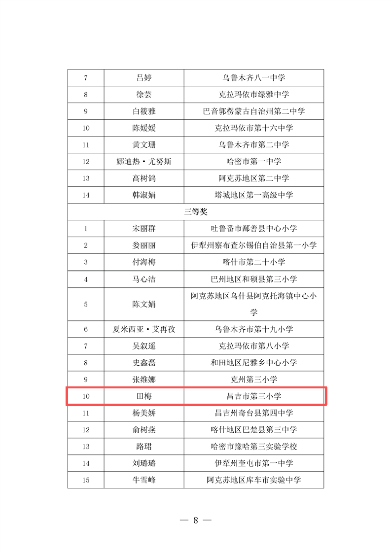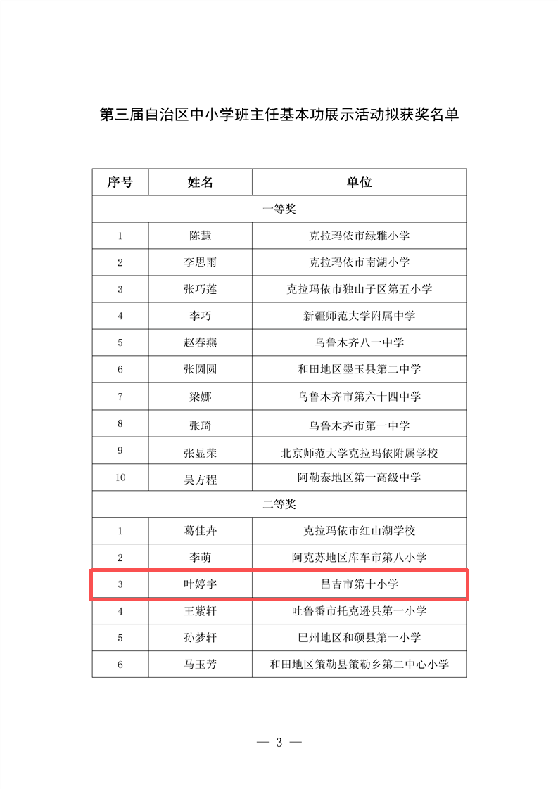 近日,新疆维吾尔自治区教育厅公布了第三届自治区中小学班主任基本功和思政课教师教学基本功展示活动结果,昌吉市多位老师上榜。昌吉市第十小学教师叶婷宇、昌吉市第一中学教师唐凯琦、昌吉市第二小学教师于小斐分别荣获自治区中小学班主任基本功展示活动二等奖、三等奖和优秀奖;昌吉市第三小学教师田梅荣获自治区思政课教师教学基本功展示活动三等奖。