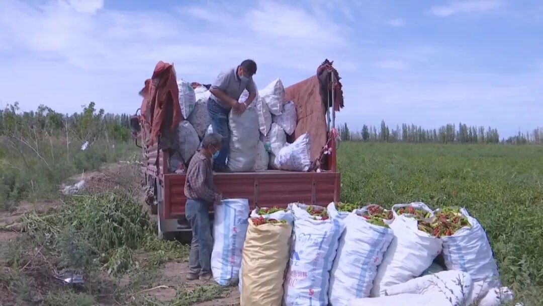 “为了把我们农民的鲜食辣椒早早变现、抢市场,增加农民的收入,我们村上协调了8名固定的商贩进行拉运,协调劳动力180人采摘辣椒,目前已经采摘了三分之一,计划在本月底,把头遍辣椒采摘完毕。”昌吉市佃坝镇佃坝村党委委员何帆梅说。