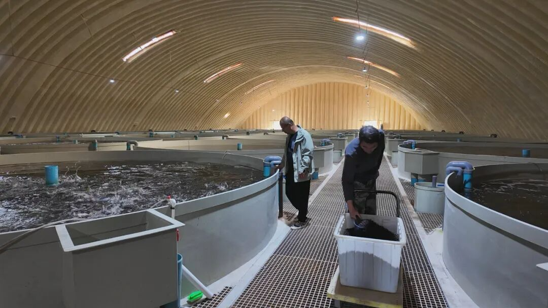 在六工镇十三户村的新疆海威渔业有限责任公司养殖车间,80立方米的养殖大罐整齐排列,罐内的鱼苗悠然游弋,工作人员一边精准投喂饵料,一边仔细检查循环水养殖系统。