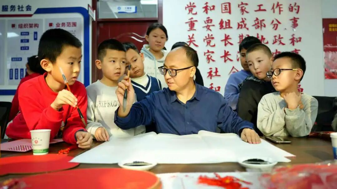 书法体验区,孩子们握笔临摹,一笔一画写下“福”字与春联。书法老师靳惠民边示范边叮嘱:“写‘福’如做人,正直踏实才是福。”刚写完福字的郑宇辰满脸喜悦:“我要贴自家门上,还给爷爷奶奶送一副!”